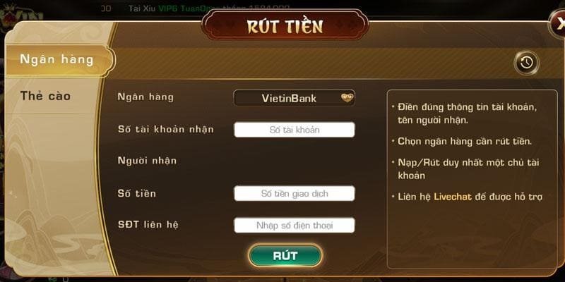 Tài khoản nhận tiền phải trùng khớp với thông tin cá nhân của người chơi. Trong trường hợp sai lệch, hệ thống sẽ tự động từ chối giao dịch.